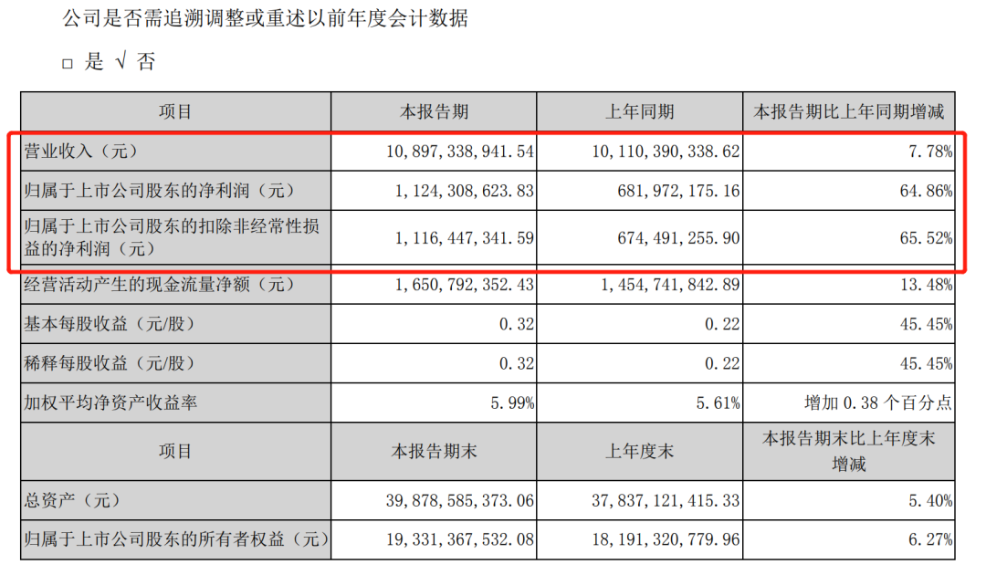 今年一季度,该公司营业收入为108.97亿元,净利润为11.24亿元,分别同比增长7.78%、64.86%。