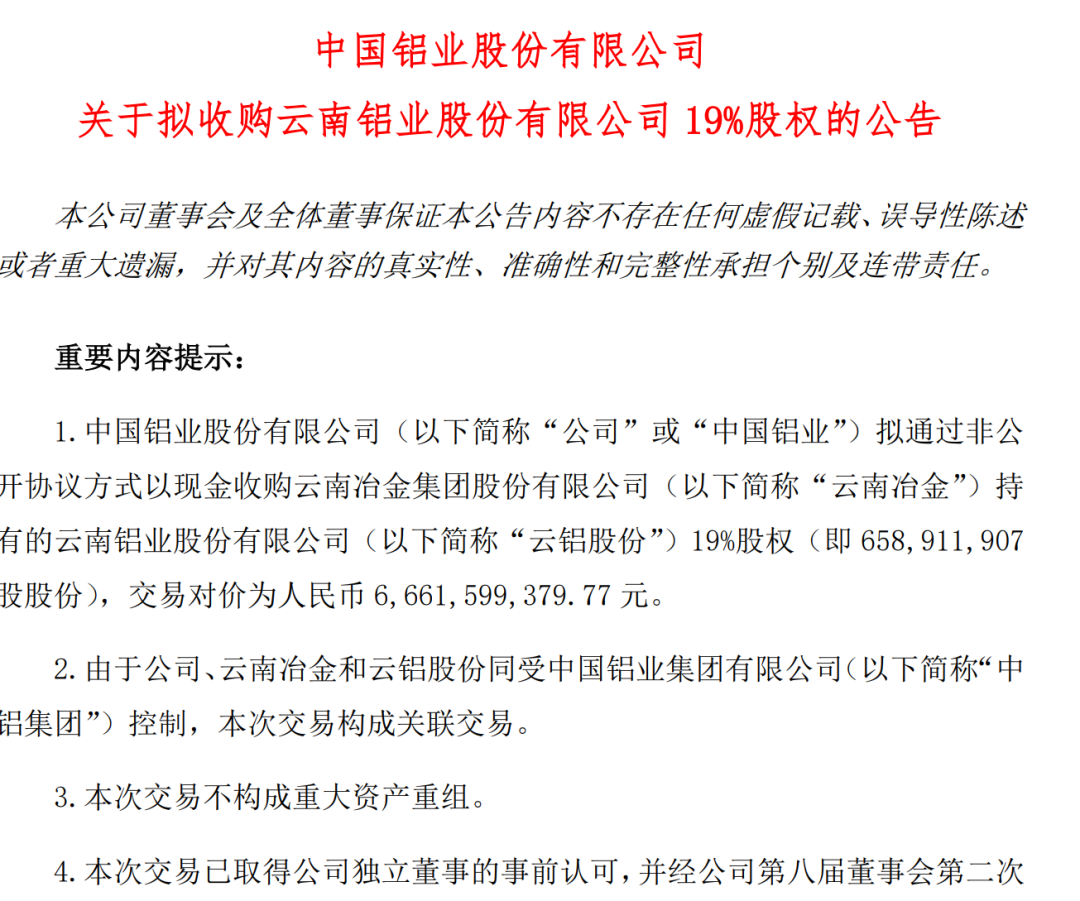 7月24日晚间,中国铝业、云铝股份(000807)相继公告,中国铝业拟收购云铝股份19%的股权。交易完成后,中国铝业将持有云铝股份约29.10%的股份,成为后者第一大股东,并将其纳入合并报表范围。