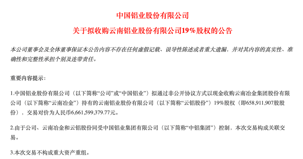 7月24日晚间,中国铝业发布公告,拟通过非公开协议方式,以现金收购云南冶金持有的收购云铝股份19%的股权。此次交易价格拟定为10.11元/股,交易对价总额为66.62亿元。截至最新收盘日,云铝股份现价为9.58元/股。
