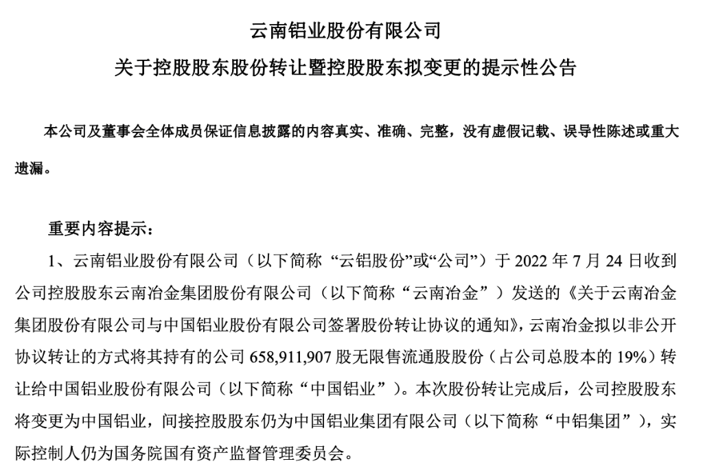 同日,云铝股份发布控股权变更提示公告,此次股份转让完成后,公司控股股东将变更为中国铝业,间接控股股东仍为中国铝业集团有限公司(下称“中铝集团”),实际控制人仍为国务院国资委。