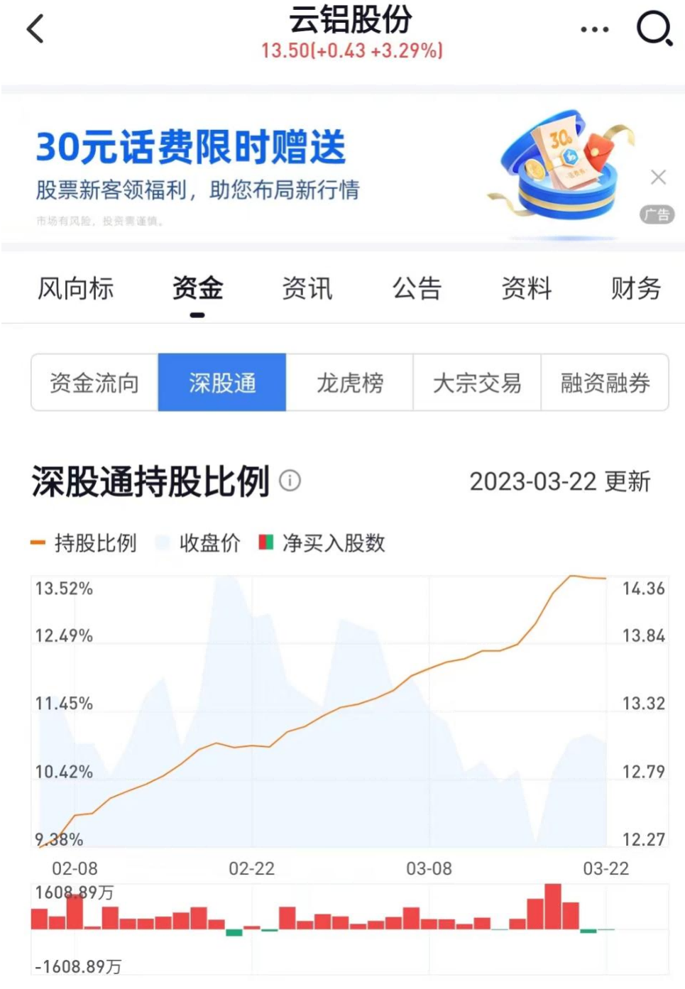 除了邓晓峰的买入外,北向资金的持续流入也值得关注。2022年底,云铝股份的深股通持股比例还只有6%左右,而截至3月22日,北向资金持股比例已来到13.47%,持股量也从2亿暴增到4.7亿左右。