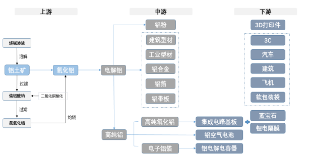 我们都知道,铝加工首先需要将矿石中的铝制备成氧化铝,再将氧化铝电解,以便进一步制成铝合金、高纯铝的不同产品。下图反映了铝产业链的基本情况。