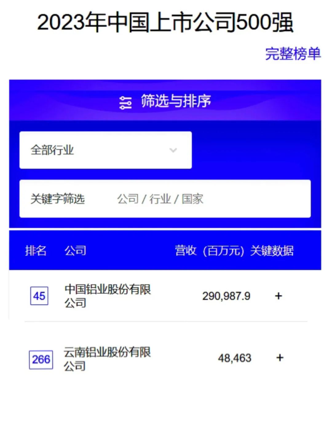 2023年《财富》中国上市公司500强排行榜由《财富》(中文版)与中金公司合作编制并首次发布。评选范围覆盖在中国境内外上市的所有中国公司,依据数据为上市公司在各证券交易所的正式披露信息。榜单以营业收入为依据,考量全球范围内最大的中国上市企业在过去一年的业绩和成就。500家上榜企业分布在33个行业,中铝股份和云铝股份在金属行业排行榜上排名第3位和第35位。