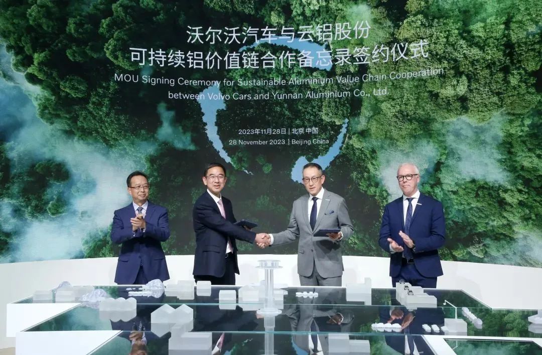11月28日,在以“链接世界,共创未来”为主题的首届中国国际供应链促进博览会上,云南铝业股份有限公司与沃尔沃汽车(亚太)投资控股有限公司签署了“可持续铝价值链合作备忘录”。双方将在负责任供应链、绿色铝生命周期评估等方面深化合作,共同推进可持续铝材在汽车生产中的应用,助力双方早日实现碳达峰碳中和目标。