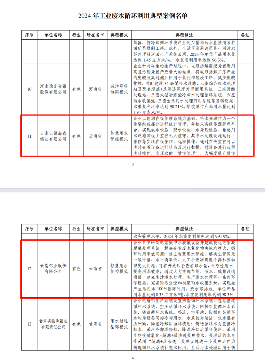近日,工业和信息化部正式公布了《2024年工业废水循环利用典型案例名单》,云铝股份及所属企业云铝海鑫凭借“智慧用水管控模式”成功入选,成为有色行业中入选的五个典型案例中的两个。