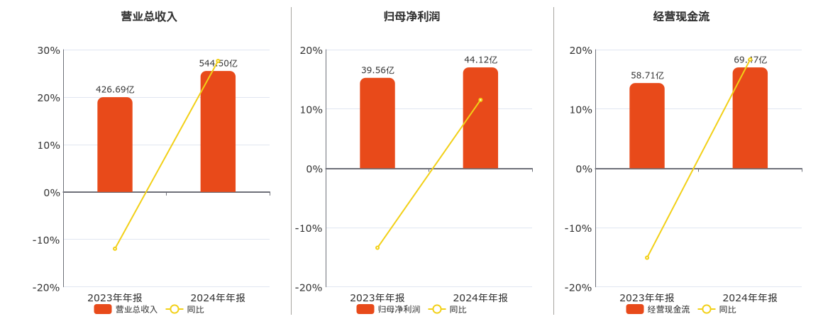 公司营业总收入为544.50亿元,较去年同报告期营业总收入增加117.82亿元,同比较去年同期上涨27.61%。归母净利润为44.12亿元,较去年同报告期归母净利润增加4.56亿元,同比较去年同期上涨11.52%。经营活动现金净流入为69.47亿元,较去年同报告期经营活动现金净流入增加10.76亿元,同比较去年同期上涨18.33%。