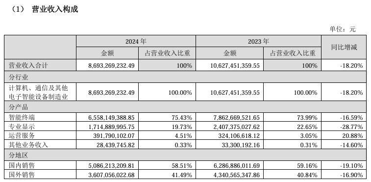 另据业绩报告显示,创维数字主要业务包括智能终端业务、专业显示业务、运营服务业务等三大业务。2024年,智能终端业务营业收入65.58亿元,因市场需求不足和产品单价下滑,同比下降16.59%;专业显示业务实现营业收入17.15 亿元,同比减少28.77%;运营服务实现营收 3.92 亿元,同比增长 20.88%。