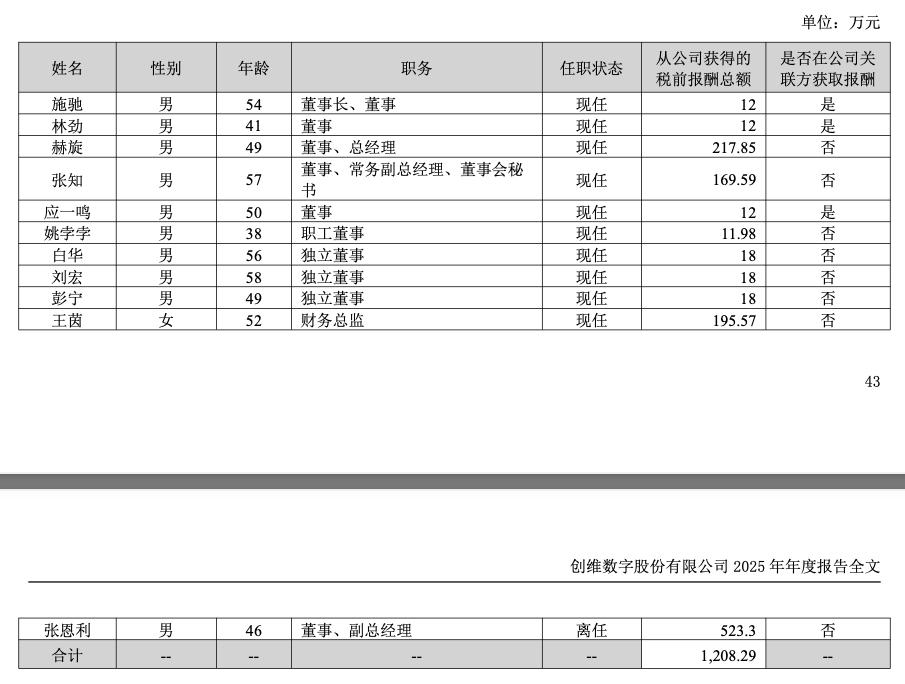 2025年年报显示,公司董事、监事和高级管理人员2025年报酬总额1,208.29万元,比2024年的2,275.88万元减少1067.59万元,同比下降46.91%。董事长、董事施驰2025年从公司获得的税前报酬总额为12万元,在公司关联方获取报酬。董事、总经理赫旋2025年从公司获得的税前报酬总额为217.85万元,未在公司关联方获取报酬。董事、常务副总经理、董事会秘书张知2025年从公司获得的税前报酬总额为169.59万元,未在公司关联方获取报酬。