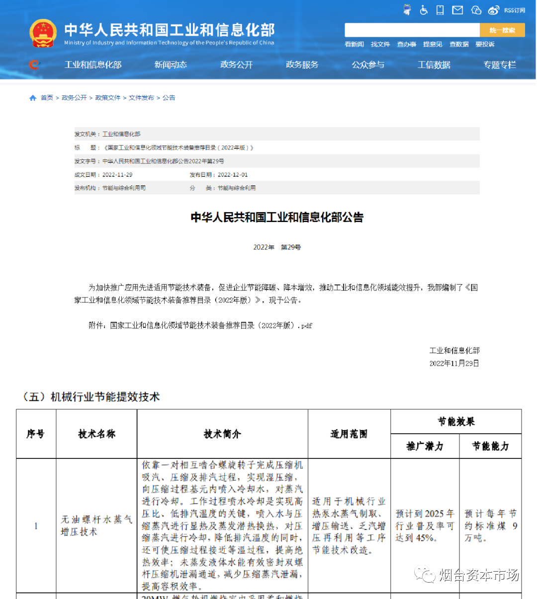 据冰轮环境官微报道,为加快推广应用先进适用节能技术装备,促进企业节能降碳、降本增效,推动工业和信息化领域能效提升,近日,工业和信息化部编制公告《国家工业和信息化领域节能技术装备推荐目录(2022年版)》。冰轮环境无油螺杆水蒸气增压技术的成功入选是国家对冰轮推进实现“双碳目标”的高度肯定。