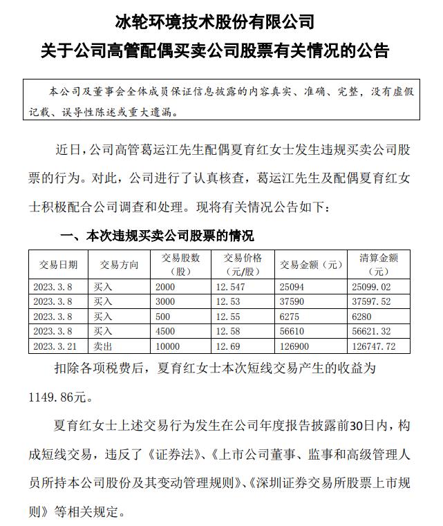 冰轮环境公告称,近日公司高管葛运江配偶夏育红发生违规买卖公司股票的行为。