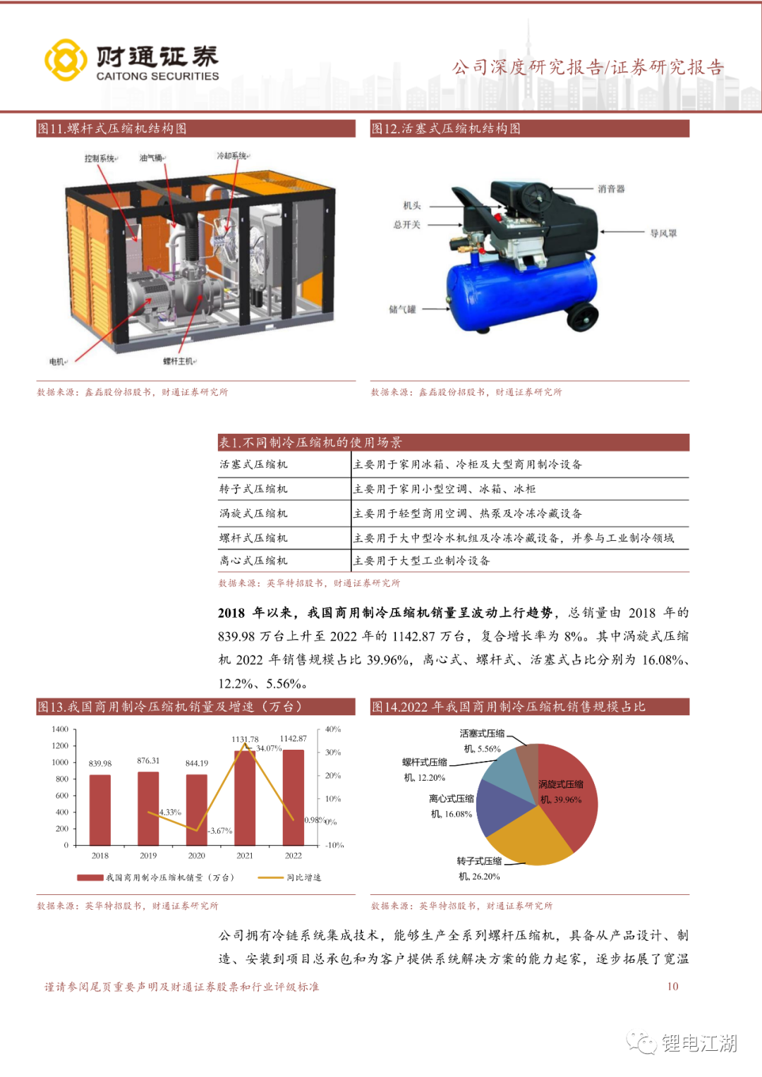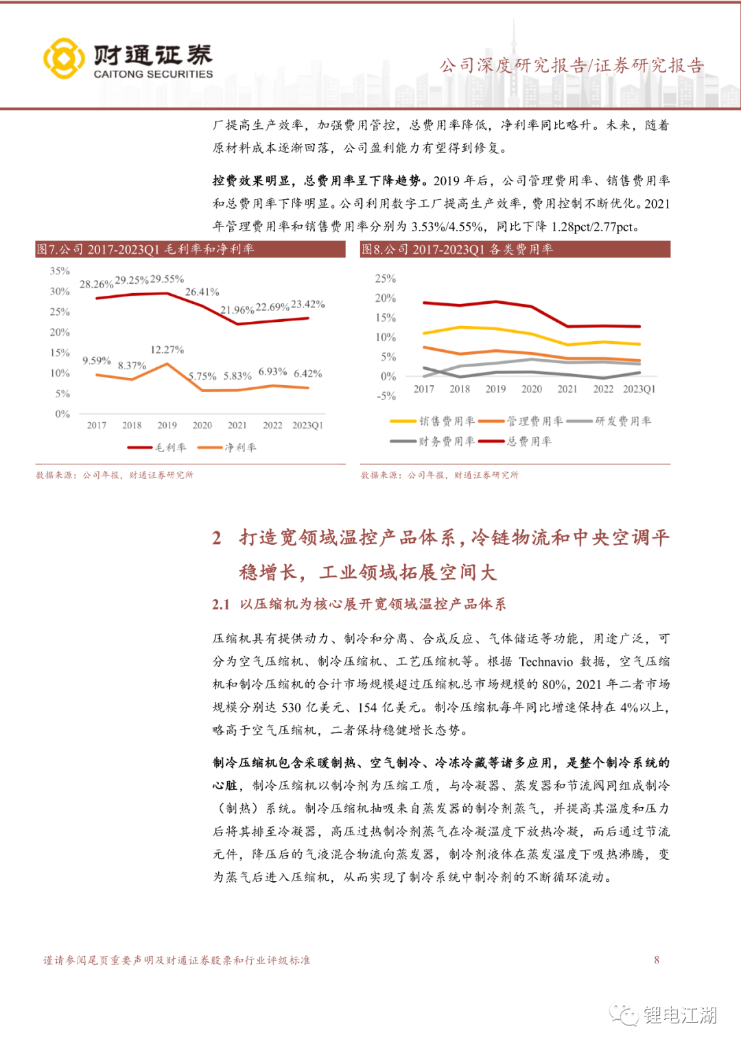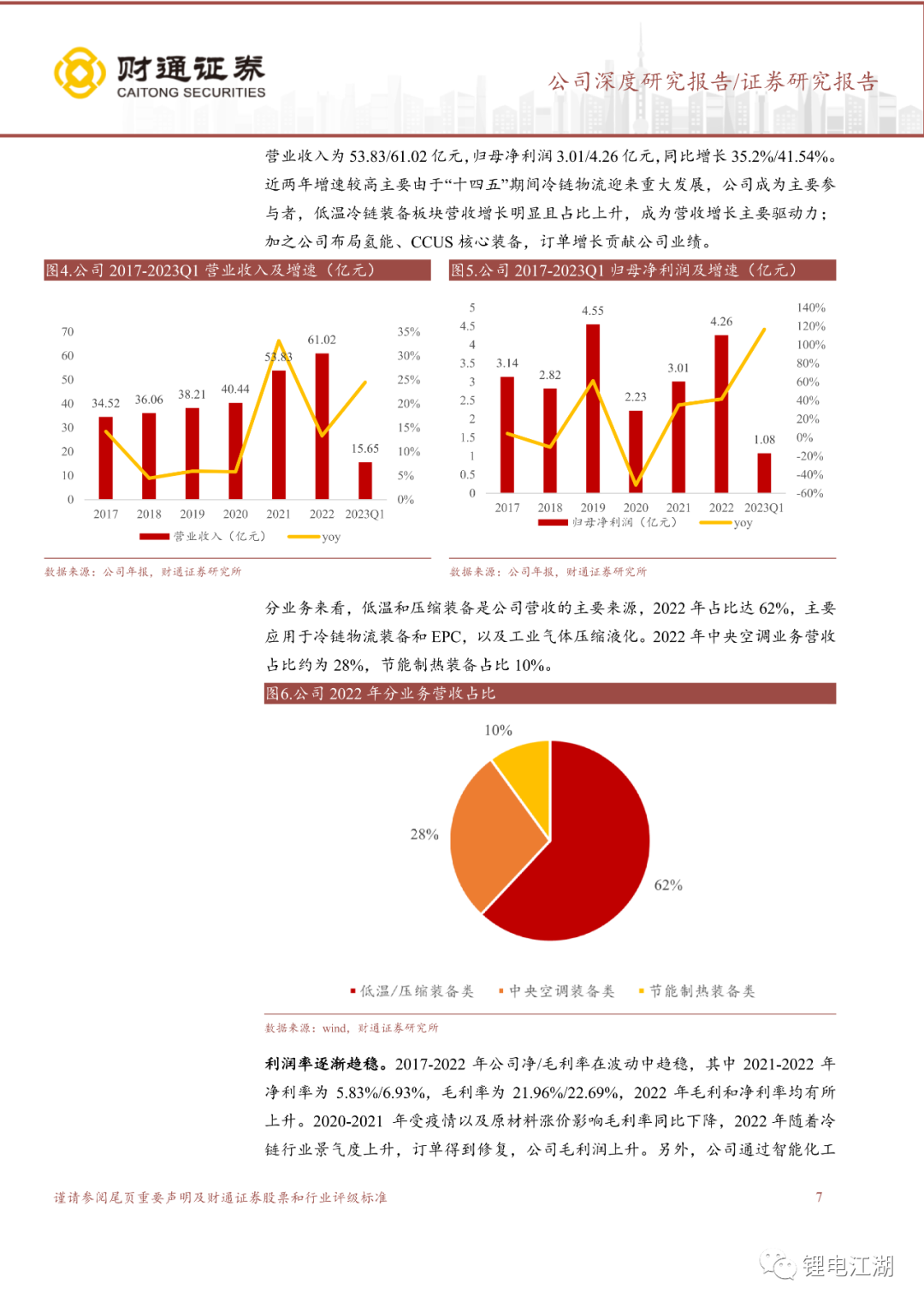 温控行业老牌企业,拓展氢能和碳捕集新航道:公司以制冷压缩机设备起家,形成工商业制冷、中央空调、节能制热三大业务,布局氢能、CCUS设备等赛道。2022年以来,受益于冷链物流景气度上行和其他领域业务的拓展,公司收入同比增长13.34%至61.02亿元,其中工商业制冷、中央空调、节能制热分别占比62%、28%、10%,归母净利润同比增长41.54%至4.26亿元。