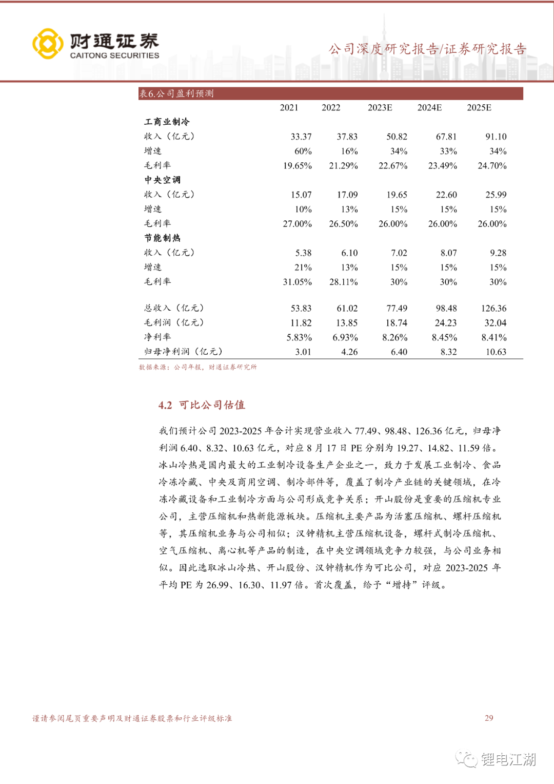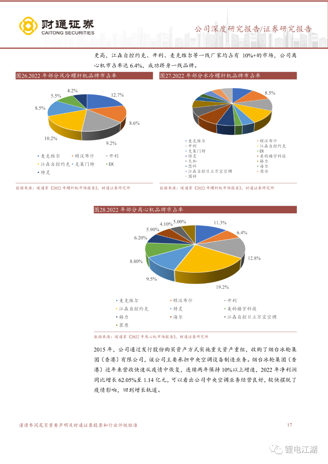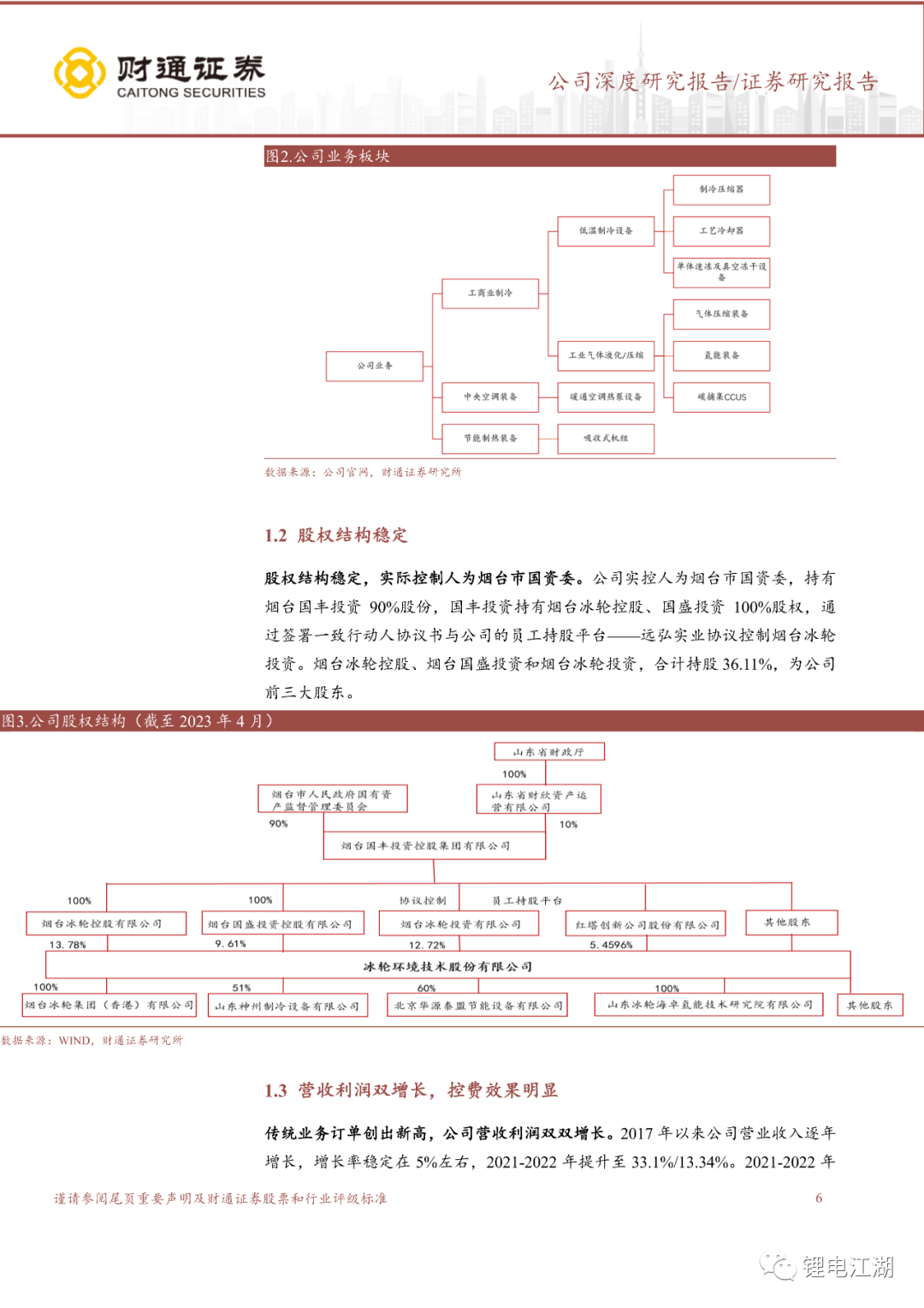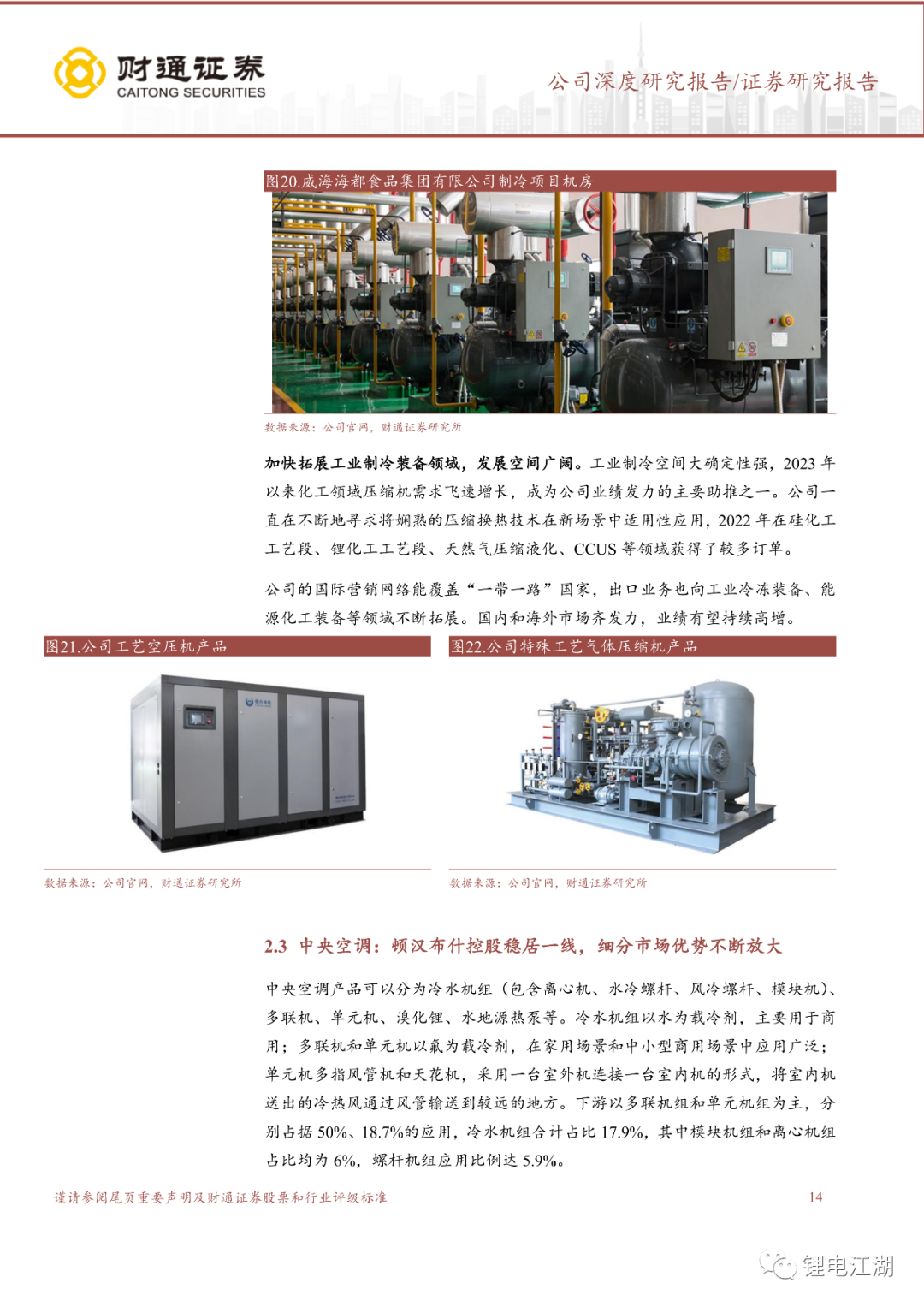 温控行业老牌企业,拓展氢能和碳捕集新航道:公司以制冷压缩机设备起家,形成工商业制冷、中央空调、节能制热三大业务,布局氢能、CCUS设备等赛道。2022年以来,受益于冷链物流景气度上行和其他领域业务的拓展,公司收入同比增长13.34%至61.02亿元,其中工商业制冷、中央空调、节能制热分别占比62%、28%、10%,归母净利润同比增长41.54%至4.26亿元。