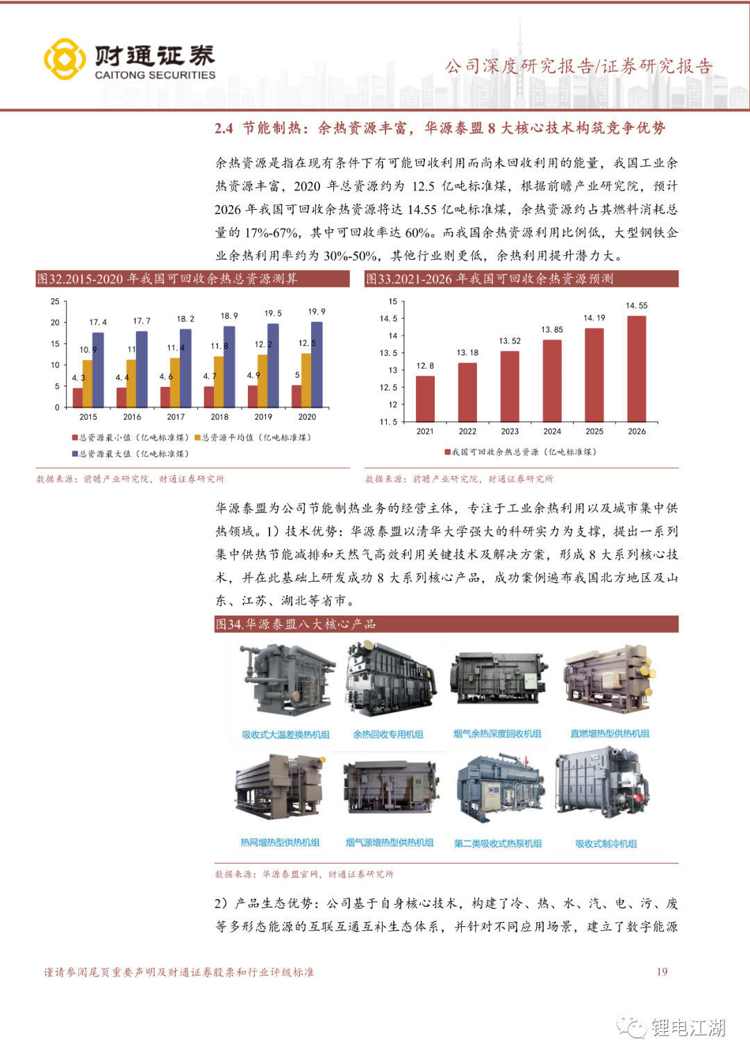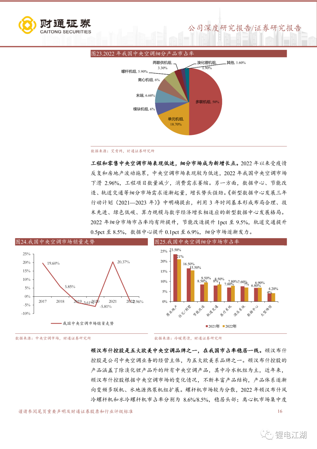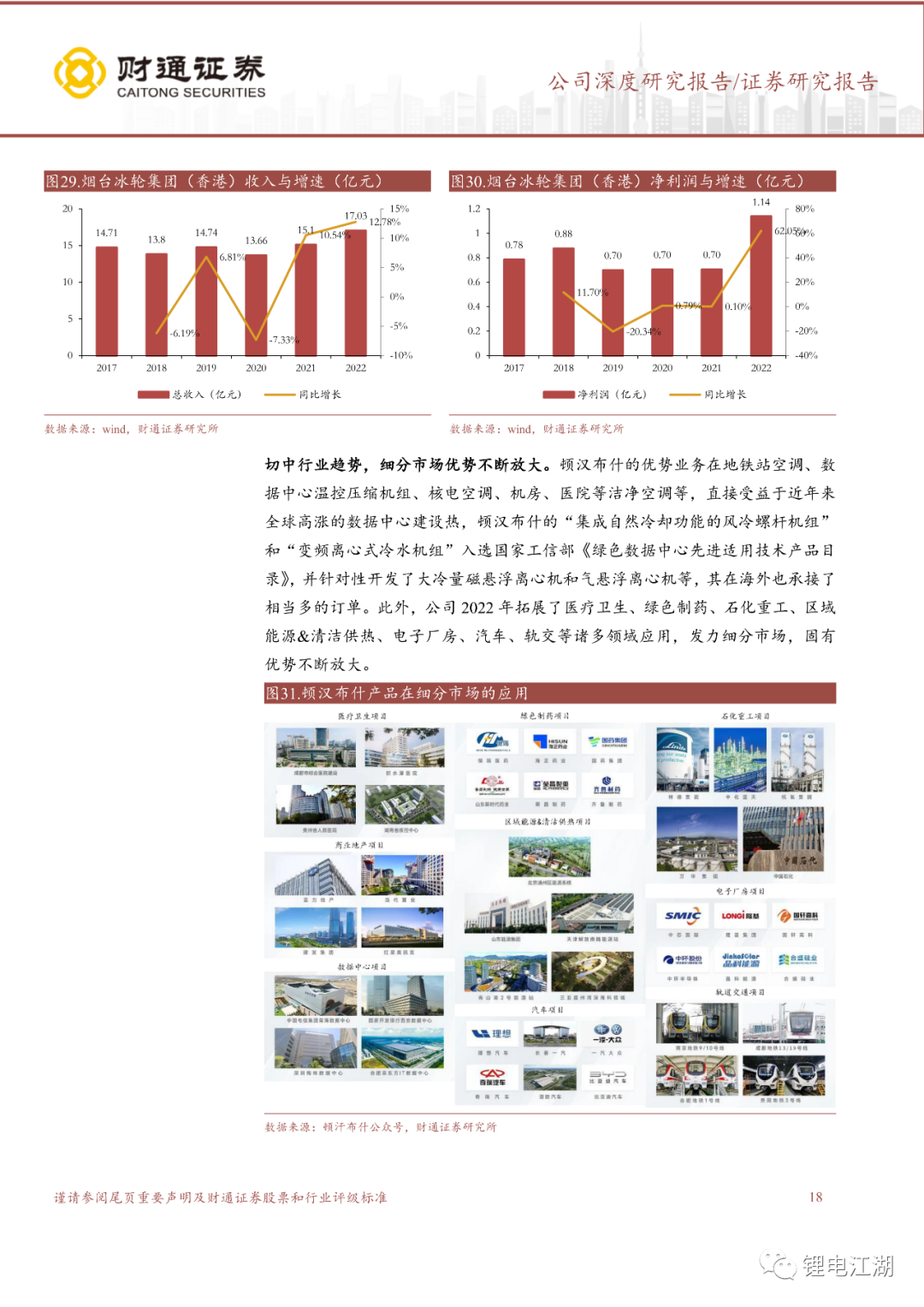 打造宽领域温控产品体系,冷链物流和中央空调平稳增长,工业领域拓展空间大:工商业制冷方面,2022年以来受疫情影响的冷链基地项目重启,行业重回高增长,2023年1-5月我国冷链物流基础设施投资同比增长6.6%。公司在冷链物流领域的市占率在30%左右,技术优势领先。2023年以来化工领域需求快速增长,工业制冷市场广阔,公司加快布局工业制冷装备,未来增长空间大。中央空调方面,工程和零售中央空调市场整体低迷,数字中心、医疗等细分市场成为新增长点。顿汉布什控股是五大欧美中央空调品牌之一,2022年其风冷/水冷螺杆压缩机市占率分别为8.6%/8.5%,稳居头部,其在地铁站空调、数据中心温控等场景的固有优势放大,发力细分市场。节能制热方面,我国余热资源丰富。华源泰盟具备8大核心技术,持续发力余热市场。