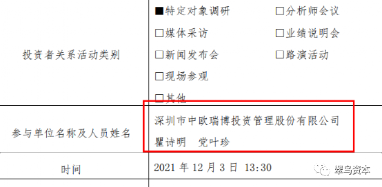 12月9日,陕西金叶回复函提供了一个机构调研信息:2021年以来,公司仅于2021年12月3日接待了1家特定对象调研。