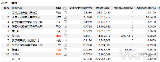 第一大股东万裕文化产业有限公司通过普通证券账户持有公司股票7000万股,通过投资者信用证券账户持有公司股票3691万股,合计持有公司股票1.07亿股。
