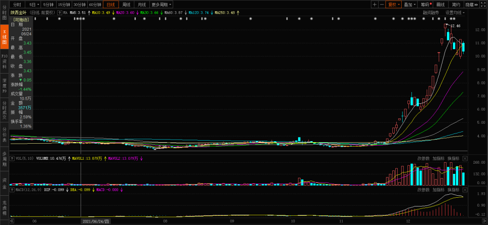 2021年11月23日至12月20日,陕西金叶“妖性”十足,在连续20个交易日内实现14次涨停,股价由3.8元/股直线拉升至12.46元/股,阶段性涨幅228%。此前近两年时间内,陕西金叶股价一直在3元左右徘徊。