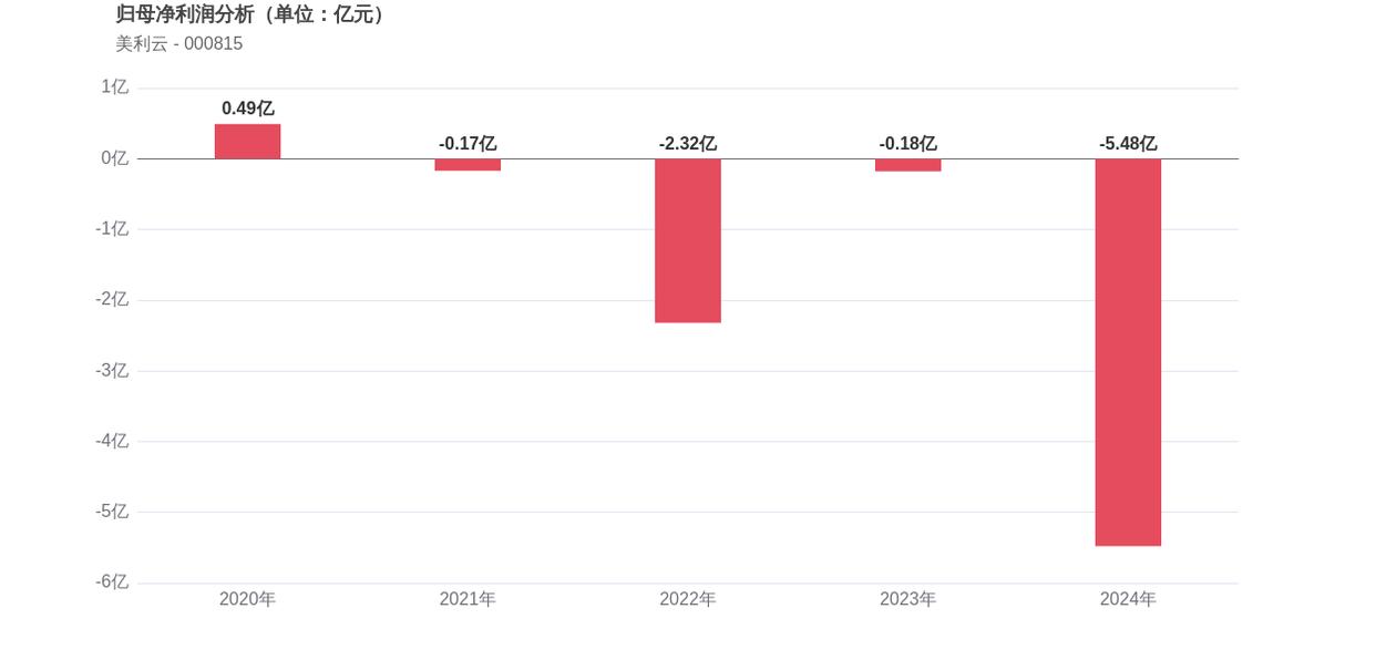 利润角度分析,2020年美利云实现归母净利润0.49亿元,2024年-5.48亿元。公司盈利状况急剧恶化,连续多年出现大幅亏损。