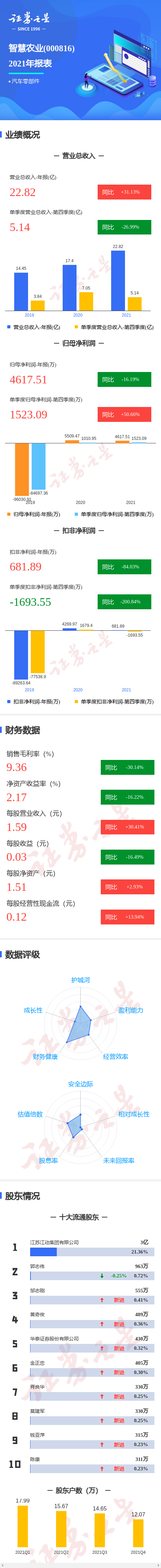 智慧农业2021年报显示,公司主营收入22.82亿元,同比上升31.13%;归母净利润4617.51万元,同比下降16.19%;扣非净利润681.9万元,同比下降84.03%;其中2021年第四季度,公司单季度主营收入5.15亿元,同比下降26.99%;单季度归母净利润1523.1万元,同比上升50.66%;单季度扣非净利润-1693.55万元,同比下降200.84%;负债率34.9%,投资收益4143.12万元,财务费用849.48万元,毛利率9.36%。