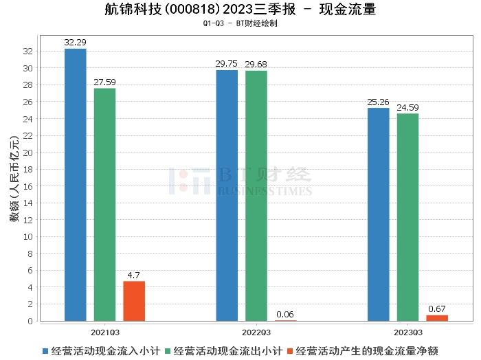 在现金流量方面,航锦科技2023年三季度的经营活动产生的现金流量净额为6656.19万元,大幅度提升,远超过上年同期的643.37万元。经营活动现金流入小计为25.26亿元,经营活动现金流出小计为24.59亿元。这些数据显示,公司的现金流量状况良好,经营活动产生的现金流量净额大幅提升。