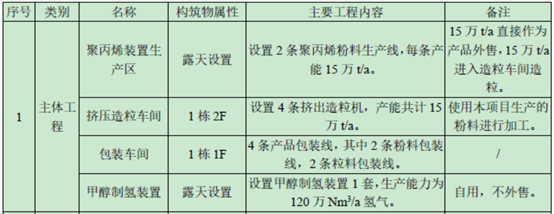 项目聚丙烯生产拟采用国内成熟的“淤浆聚合+气相卧釜聚合”SPG-II聚丙烯工艺。项目主要产品为聚丙烯增韧改性专用料、聚丙烯通用料、聚丙烯注塑料和聚丙烯纤维料,年生产总规模30万吨。此外,项目配套甲醇制氢装置进行氢气生产,所产氢气自用不外售,项目生产过程中产生的副产品粗丙烯作为产品外售。