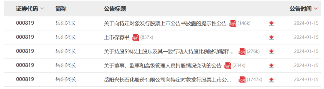 1月14日,岳阳兴长发布多项公告,对公司向特定对象发行股票上市的报告书、保荐书等文件进行披露。