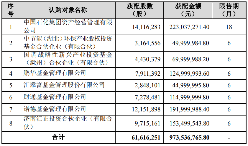 本次发行对象最终确定为8家,所有发行对象均以现金方式认购本次发行的普通股股票,本次发行中,大股东中国石化集团资产经营管理有限公司认购本次定增股票2.23亿。本次发行配售结果如下:
