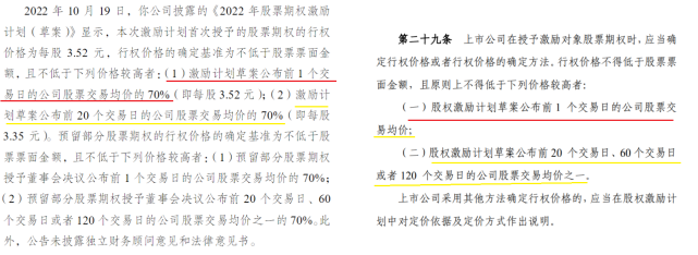 关注函指出,此次股权激励的股票期权的定价低于《上市公司股权激励管理办法》第二十九条规定的行权价格。雷达财经注意到,第二十九条规定,上市公司在授予激励对象股票期权时,应当确定行权价格或者行权价格的确定方法。行权价格不得低于股票票面金额,且原则上不得低于下列价格较高者:股权激励计划草案公布前 1 个交易日的公司股票交易均价;股权激励计划草案公布前 20 个交易日、60 个交易日或者 120 个交易日的公司股票交易均价之一。