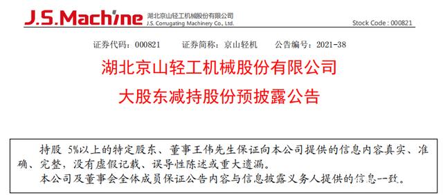 8月10日晚,京山轻机(000821.SZ)发布《大股东减持股份预披露公告》,持股5%以上的大股东王伟拟减持不超780万股公司股份。