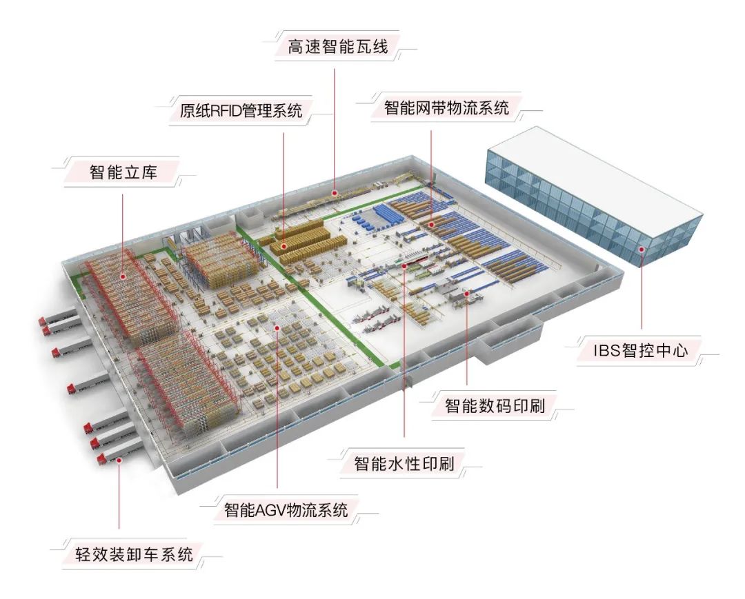 同时还配置一套IBS智能化工厂管理系统,实现设备间互联互通及工厂高效运营决策管理。后期逐步按总体规划进行智能工厂建设,在园区内部逐步打造形成纸板/纸箱生产制造及配套智能的包装科技园。