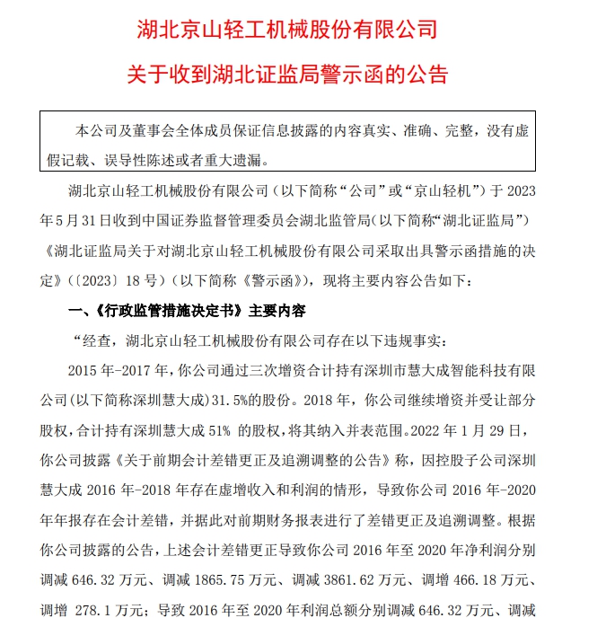 湖北证监局指出,京山轻机在2018年将深圳慧大成纳入并表范围后,因其虚增收入和利润,导致公司2018年-2020年年报出现会计差错,违反了《信息披露管理办法》(证监会令第40号)第二条第一款的规定。