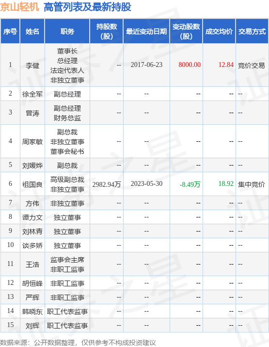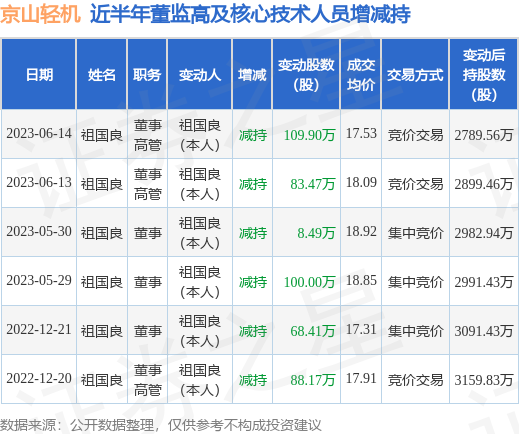 根据6月15日市场公开信息、上市公司公告及交易所披露数据整理,京山轻机(000821)最新董监高及相关人员股份变动情况:2023年6月14日公司董事,高管祖国良共减持公司股份109.9万股,占公司总股本为0.1764%。变动期间公司股价下跌2.69%,6月14日当日收盘报17.39元。