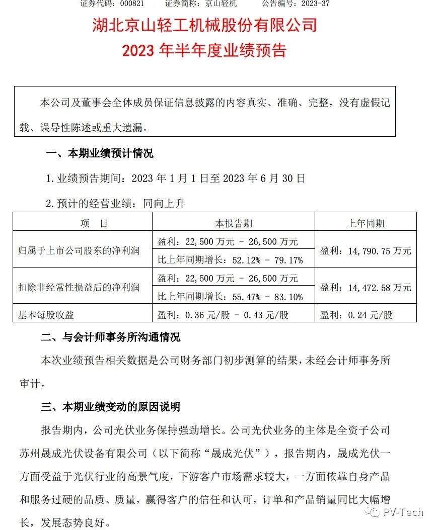 对于业绩增长的原因,京山轻机表示,主要是公司光伏业务保持强劲增长。