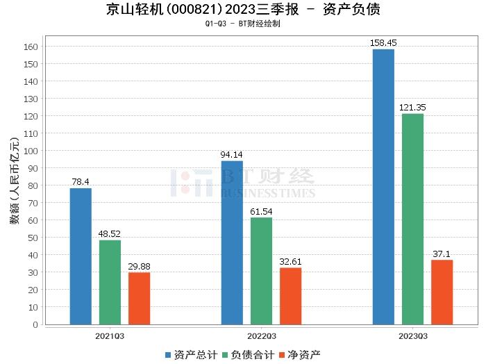 从资产负债方面来看,京山轻机在2023年三季度的总资产为158.45亿元,相比上年度末的99.64亿元有显著增长。负债合计在本报告期末为121.35亿元,相比上年度末的66.02亿元也有所增加。净资产在本报告期末为37.1亿元,相比上年度末的33.62亿元略有增长。资产负债率在本报告期末为76.58%,相比上年度末的66.26%有所上升。