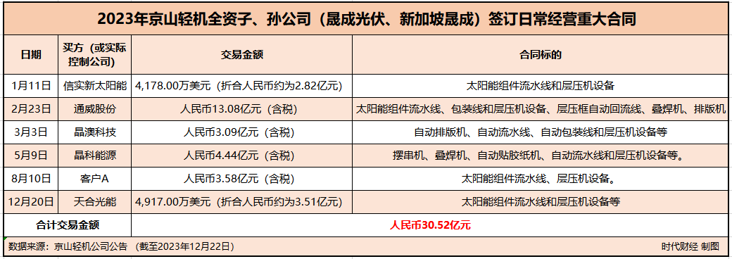 时代财经注意到,2023年以来,京山轻机接连签订光伏设备大单,客户有通威股份(600438.SH)、晶科能源(688223.SH)、晶澳科技(002459.SZ)等及关联公司,合计交易金额为30.52亿元。