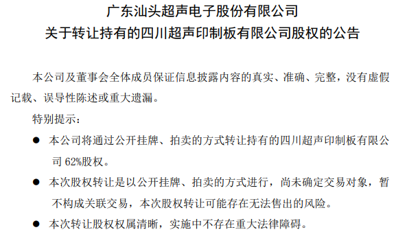 此外,为进一步整合公司资源,优化公司业务结构及资产结构,减少投资风险,超声电子还发布公告称,拟通过北京产权交易所公开挂牌、拍卖转让持有的四川超声印制板有限公司(简称四川超声)62%股权。
