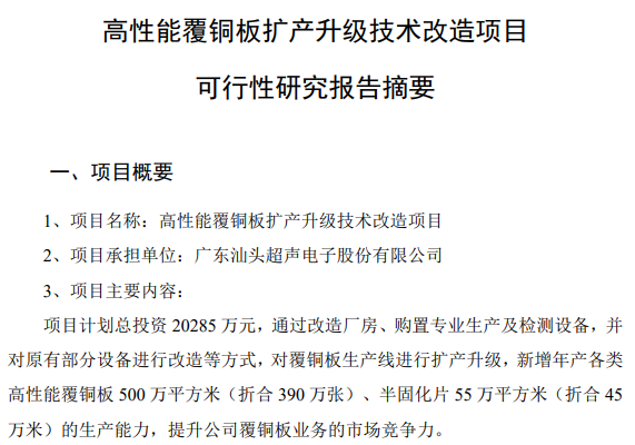 为适应PCB客户发展对覆铜板材料供应能力的各种需求,及时把握发展机遇,增强产业竞争优势,公司决定实施“高性能覆铜板扩产升级技术改造项目”,快速扩充高性能覆铜板的生产能力,满足现有客户发展需求,加快覆铜板业务的发展步伐。