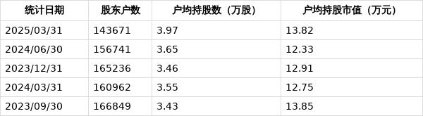 从4月28日公开信息显示,太钢不锈截至2025年3月31日公司股东户数为14.37万户,较上期(2024年6月30日)减少6231户,降幅为4.16%,变化不大。
