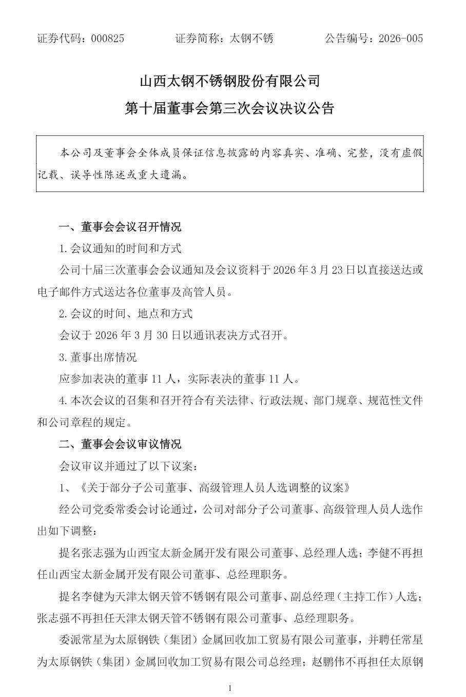 3月30日晚间,山西A股龙头太钢不锈(000825)发布公告,对旗下三家重要子公司核心管理层进行集中调整。《晋才晋商》注意到,此次调整并非简单人事更替,更像是一次精准的资源调配与战略卡位。