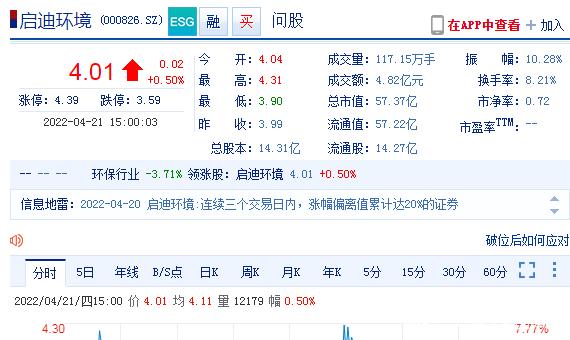 启迪环境科技发展股份有限公司(启迪环境,000826)在2022年4月21日发布了《关于股票交易异常波动的公告》。公告内容显示,公司股票交易价格于2022年4月19日、4月20日连续2个交易日收盘价格涨幅偏离值累计超过20%。根据深圳证券交易所交易规则相关规定,属于股票交易异常波动的情况。启迪环境(000826)表示,已针对公司股票交易异常波动的情况,公司进行了相关事项的必要核实,暂无发现异常之处。