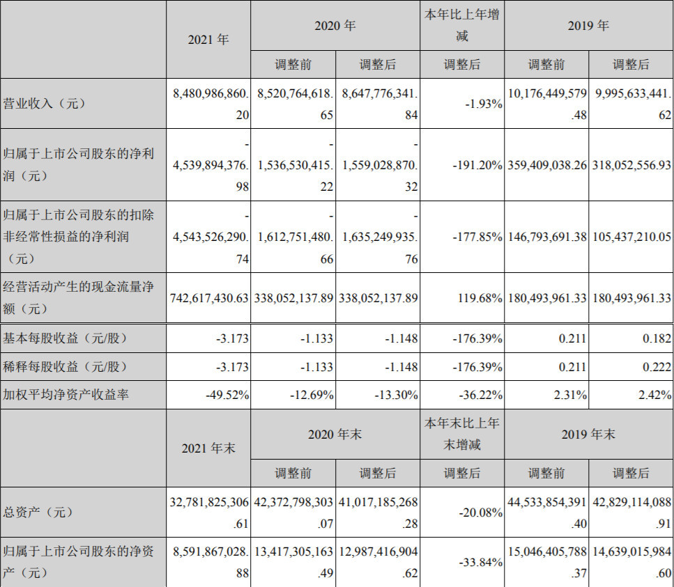 4月最后一天,启迪环境披露2021年年报,报告期内公司实现营业收入84.81亿元,同比下降1.93%;归属于上市公司股东的净利润亏损45.4亿元。与2020年相比,亏损进一步扩大。
