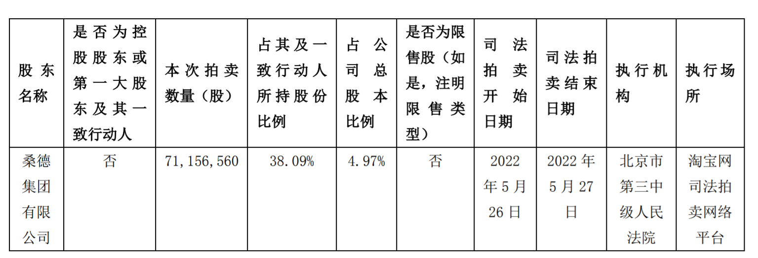 公告显示,启迪环境近日通过查询淘宝网司法拍卖网络平台获悉,北京市第三中级人民法院将于2022年5月26日10时至2022年5月27日10时止(延时的除外)进行司法拍卖活动,将公开拍卖公司持股5%以上股东桑德集团有限公司(以下简称“桑德集团”)所持启迪环境合计7115.66万股股份,目前处于拍卖公示期。