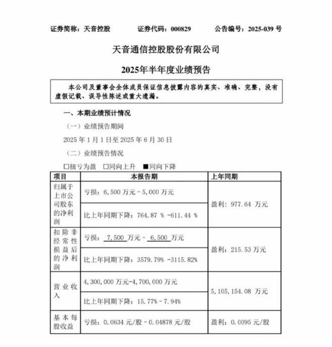 7月15日,天音控股(000829.SZ)发布2025年半年度业绩预告,预计实现营收430亿元至470亿元,同比下降7.94%至15.77%,较上年同期的510.52亿元显著缩水;归属上市公司股东净利润预计亏损5000万元至6500万元,同比暴跌611.44%至764.87%。