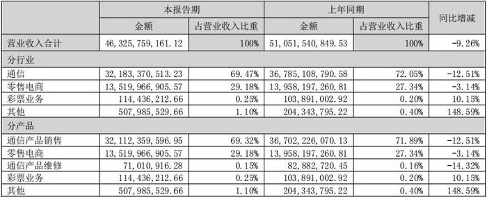 据中报信息显示,今年上半年,公司通信产品销售贡献321.12亿元收入,同比下滑12.51%,毛利率也下行到了1.72%水平。零售电商贡献收入135.20亿元,较上年同期减少3.14%,毛利率实现2.94%,同比微增。两类产品合计收入比重虽仍保持在98%以上,但此消彼长,通信产品销售收入占比进一步减少到70%以下,零售电商则增至29.18%。