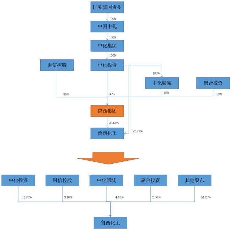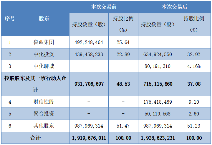 本次交易完成后,鲁西化工为存续方,将承继及承接鲁西集团的全部资产、负债、人员、业务、合同及其他一切权利与义务,鲁西集团将注销法人资格,鲁西集团持有的鲁西化工492,248,464股股票将被注销,中化投资、中化聊城、财信控股和聚合投资将直接持有以标的资产认购取得的鲁西化工股票。