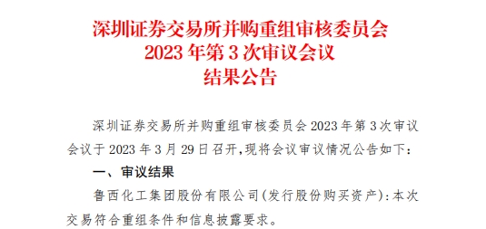 中国经济网北京3月30日讯深圳证券交易所并购重组审核委员会2023年第3次审议会议于昨日召开,对鲁西化工集团股份有限公司(以下简称“鲁西化工”,000830.SZ)发行股份购买资产进行审核。审议结果显示,鲁西化工本次交易符合重组条件和信息披露要求。