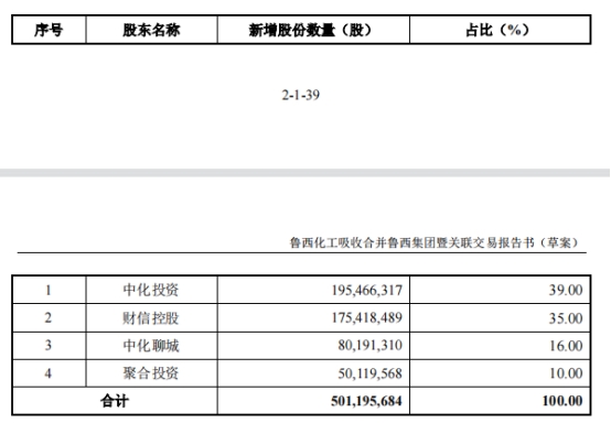 鲁西化工于3月18日披露的《吸收合并鲁西集团有限公司暨关联交易报告书(草案)(上会稿)》显示,鲁西化工通过向鲁西集团的全部股东(中化投资、中化聊城、财信控股和聚合投资)发行股份的方式对鲁西集团实施吸收合并。鲁西化工为吸收合并方,鲁西集团为被吸收合并方,中化投资、中化聊城、财信控股和聚合投资为交易对手方。