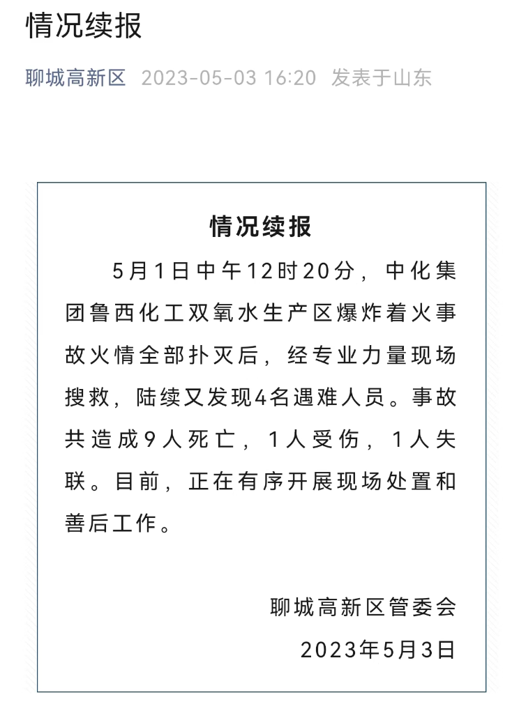 记者注意到,本次事故发生后,微信公众号“聊城高新区”已两次发布通报,5月3日下午的最新通报显示,事故火情全部扑灭后,经专业力量现场搜救,陆续又发现4名遇难人员。事故共造成9人死亡,1人受伤,1人失联。目前,正在有序开展现场处置和善后工作。