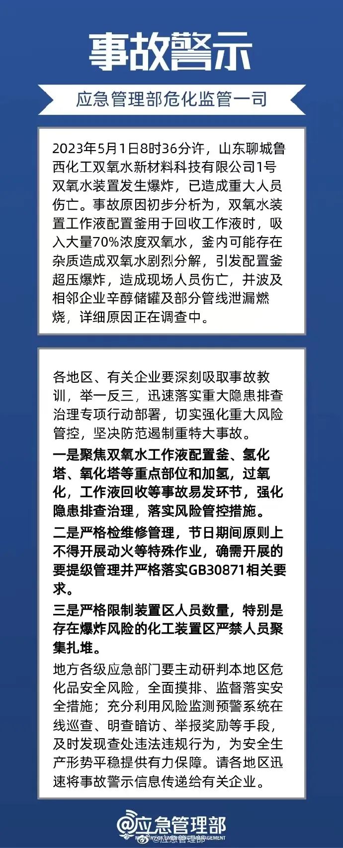 5月1日当天,山东聊城中化集团鲁西化工双氧水生产区发生爆炸火灾事故并造成重大人员伤亡,本次事故牵动了各方神经。目前,多个政府部门相继对此发声,山东省也成立了聊城鲁西化工“5·1”爆炸着火事故调查组,事故调查工作已全面展开。更多内容请看《山东聊城一工厂突发火灾!5死1伤1失联;官方:明火已扑灭,原因仍在调查中,这家A股公司回应……》