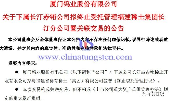 公告显示,经厦门钨业2017年年度股东大会批准,长汀赤铕公司与福建稀土集团于2018年4月25日签订了《委托管理协议》,由长汀赤铕公司受托管理福建稀土长汀分公司,托管期三年。经厦门钨业2020年年度股东大会批准,长汀赤铕公司与福建稀土集团于2021年4月25日续签了《委托管理协议》,由长汀赤铕公司继续受托管理福建稀土长汀分公司,托管期三年(生效日起)。