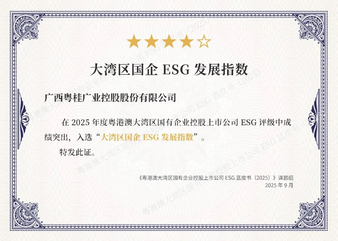 粤桂股份积极响应广东省国资委和广东环保集团关于社会责任与可持续发展的部署要求,系统构建ESG管理架构,持续完善社会责任体系,全力实现企业经营与经济效益、社会价值、生态效益的协同统一。入选“大湾区国企ESG发展指数”,不仅是对粤桂股份ESG治理、社会价值创造、风险管理等工作的高度认可,更是对公司作为国有控股上市公司践行可持续发展理念的充分肯定。